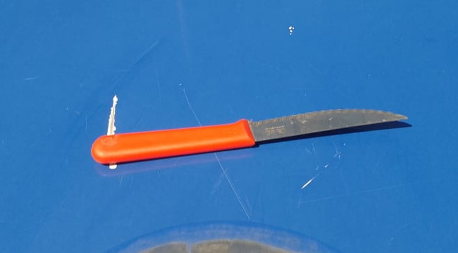 A raíz de esta situación, se montó operativo para dar con él, encontrándolo a pocas cuadras del lugar. Allí, efectivos policiales le encontraron un cuchillo serrucho, del que no pudo justificar su portación, por lo cual quedó detenido y fue trasladado a la alcaldía local.