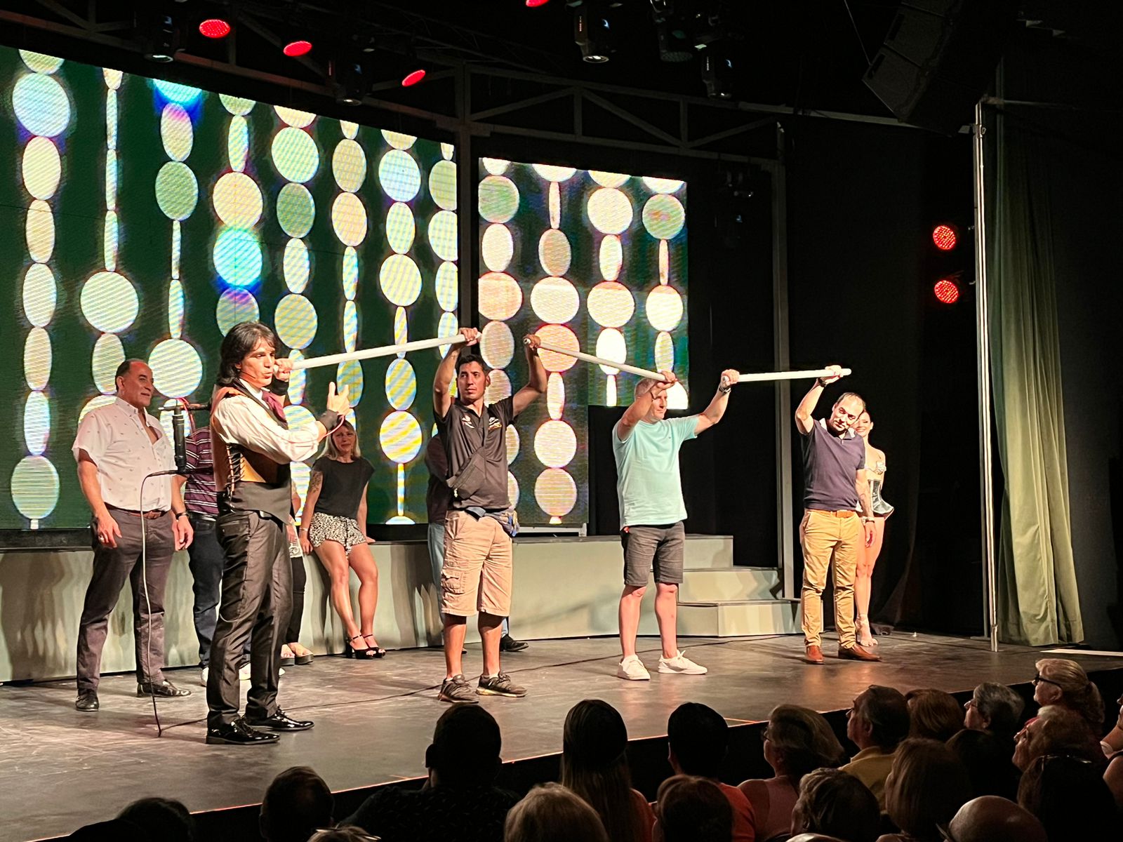 El elenco se completa por una eximia performance de bailarines y acróbatas como Mauricio Gurini, que dejan al público perplejo, bajo la dirección de la coreógrafa Mik Grimoldi.