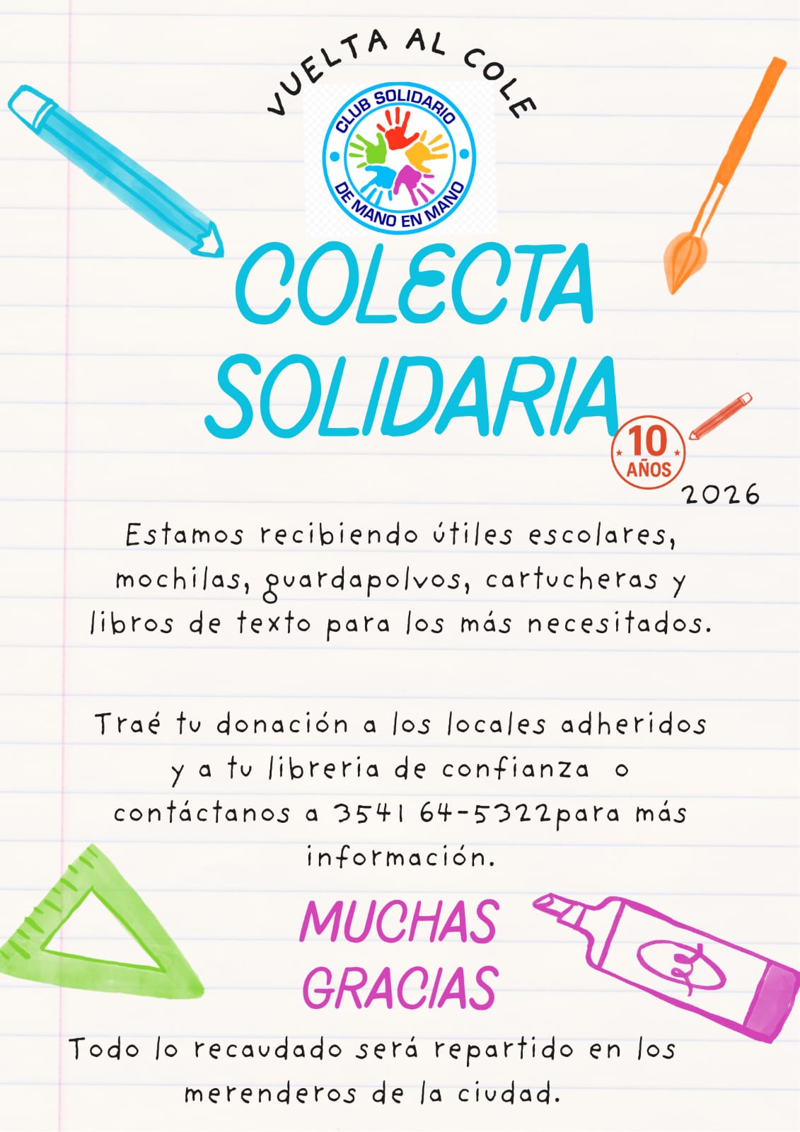 Bajo el lema «Vuelta al Cole», el Club Solidario De Mano en Mano puso en marcha su campaña solidaria 2026, una edición especial ya que la institución celebra su 10° aniversario de labor ininterrumpida en Villa Carlos Paz.