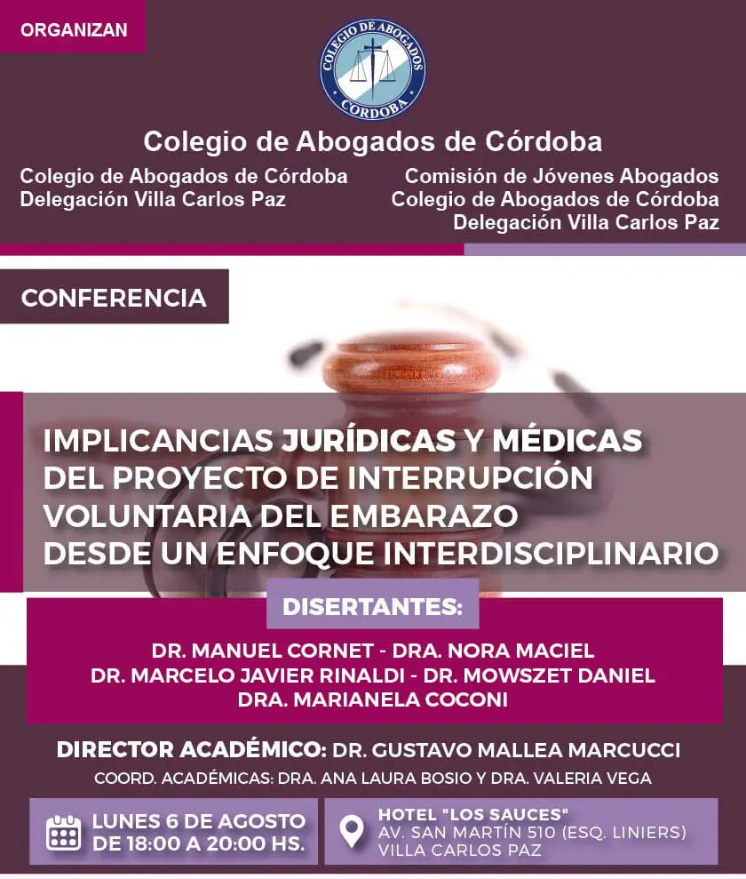El Hotel Los Sauces, será la sede de la conferencia que organiza el Colegio de Abogados de Córdoba, delegación Villa Carlos Paz sobre las implicaciones médicas y jurídicas de la Ley de Interrupción Voluntaria del Embarazo.