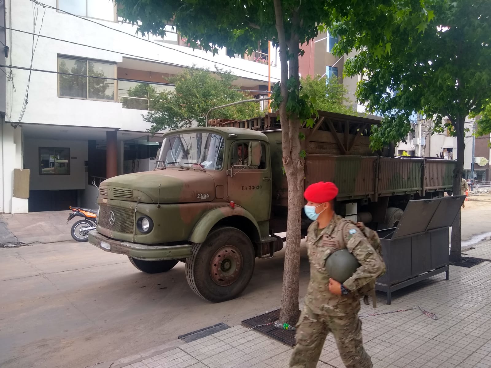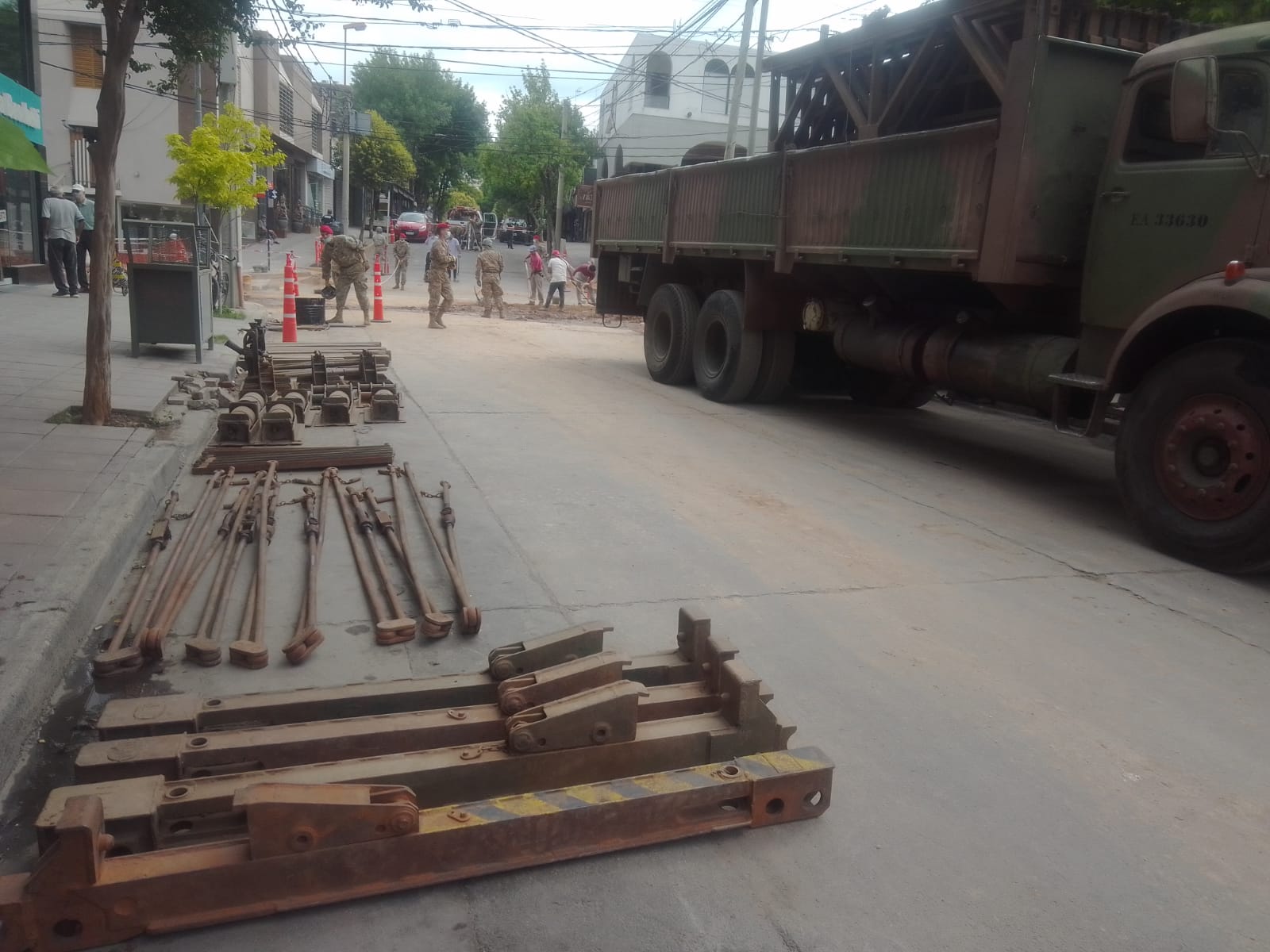 Un pelotón de soldados del Ejército llegó bien temprano este jueves al centro de la ciudad para comenzaron con el montaje del puente estructural que servirá para cruzar la calle Las Heras por Lisandro de la Torre hasta que se termine la obra de desagües en el área.