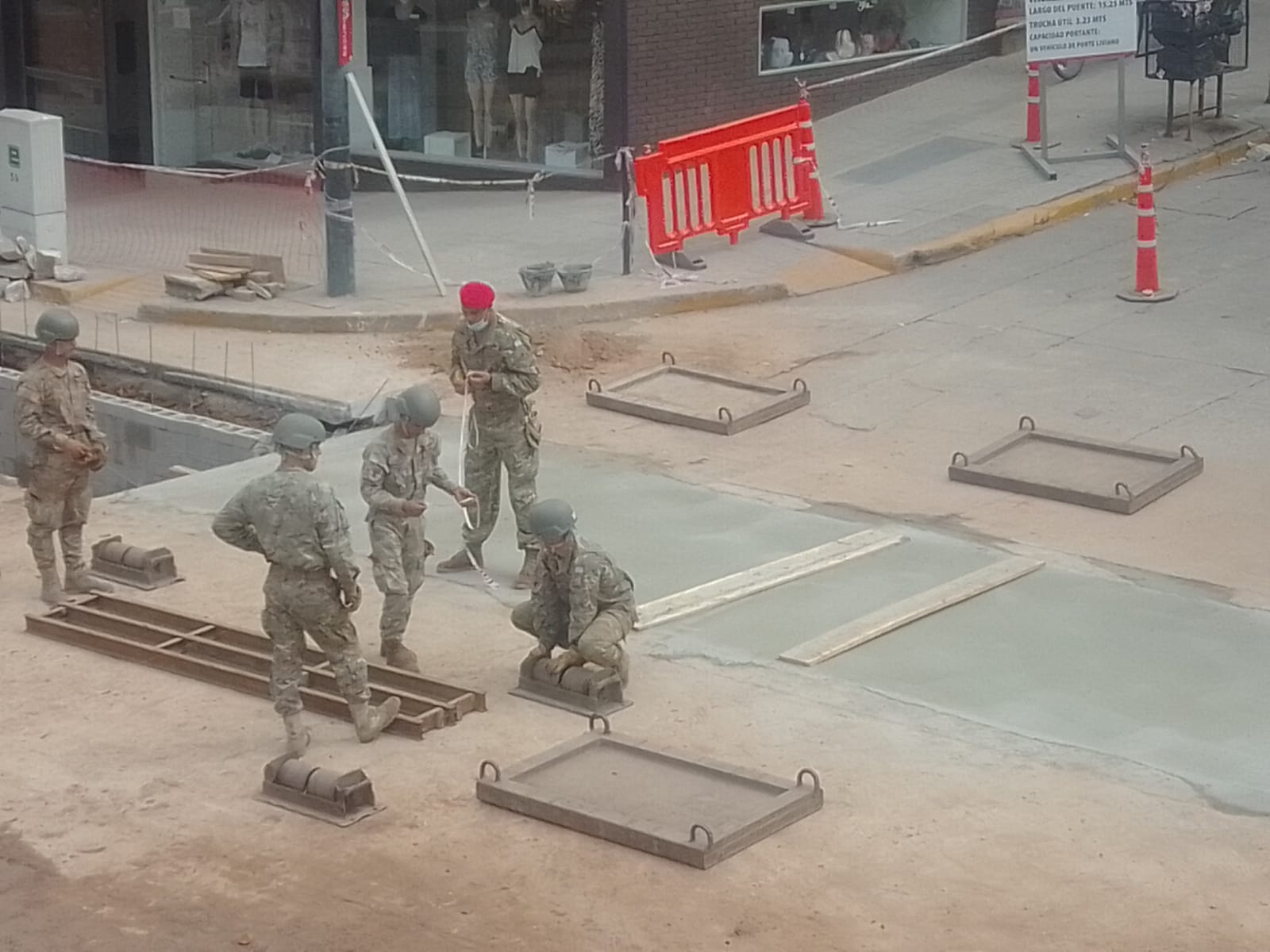 Un pelotón de soldados del Ejército llegó bien temprano este jueves al centro de la ciudad para comenzaron con el montaje del puente estructural que servirá para cruzar la calle Las Heras por Lisandro de la Torre hasta que se termine la obra de desagües en el área.