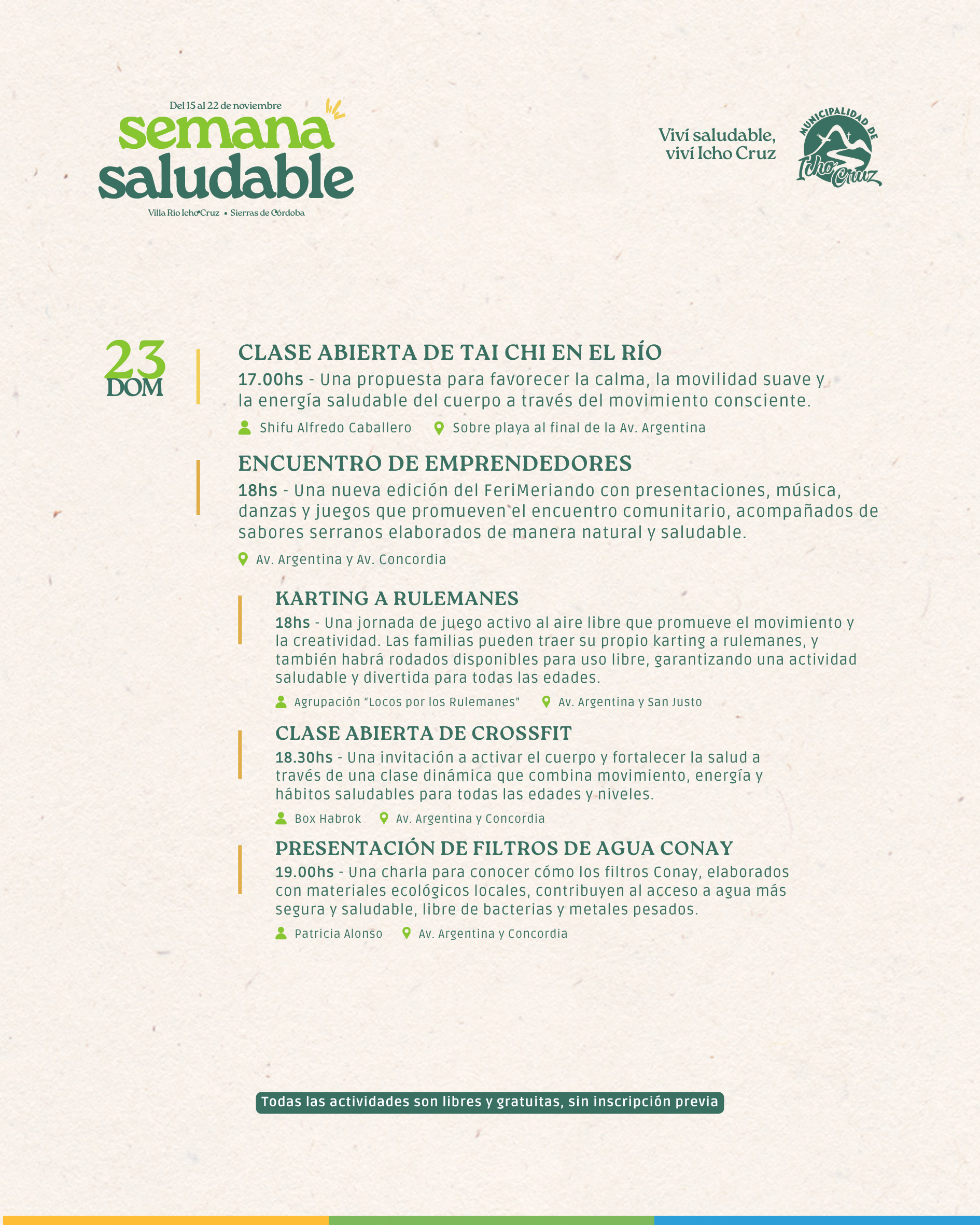 Para conocer el detalle de las actividades, se puede consultar el programa completo en las redes oficiales del Municipio. Instagram: @ichocruzok Facebook: Muni de Icho Cruz. Sitio web: www.ichocruz.gob.ar.