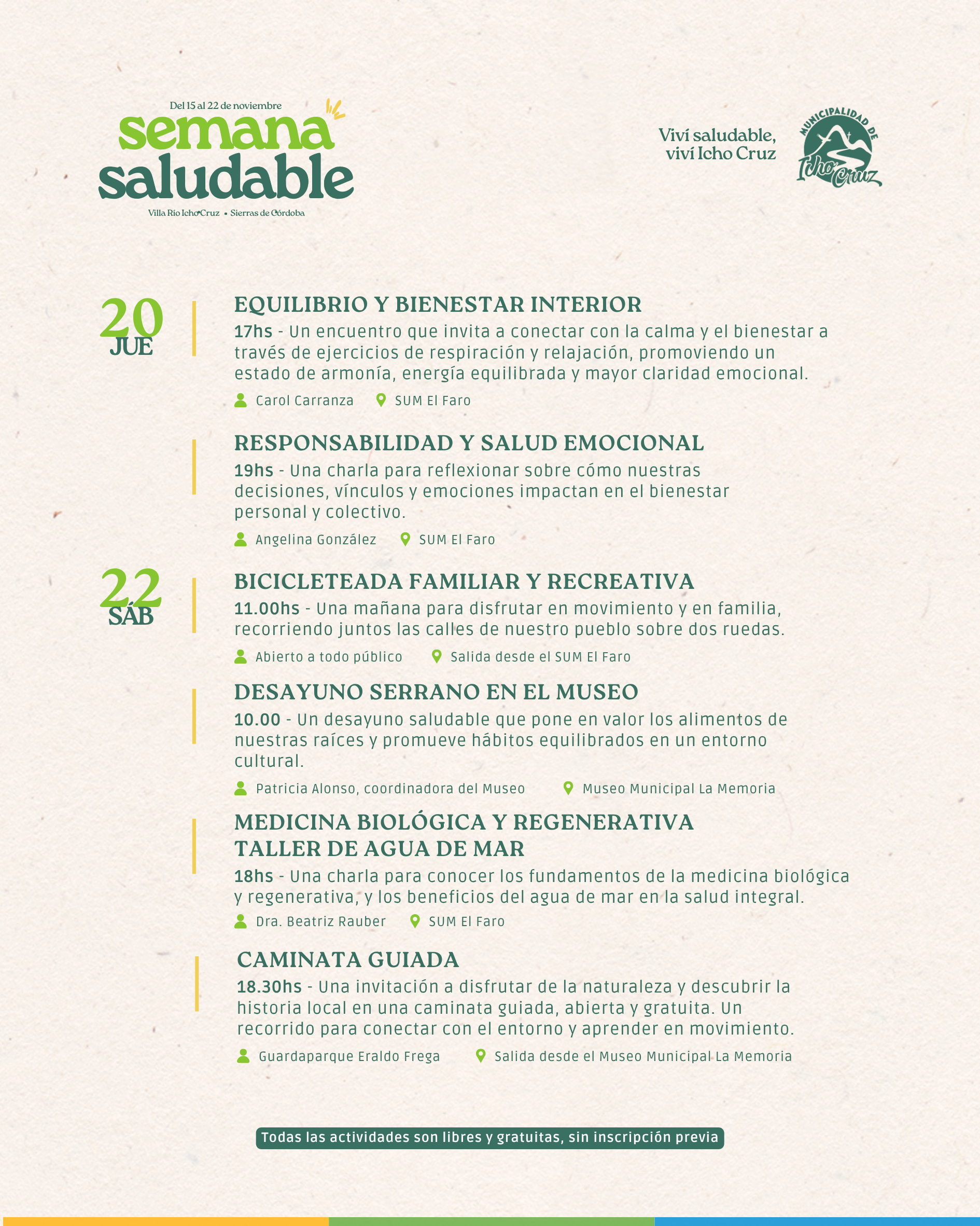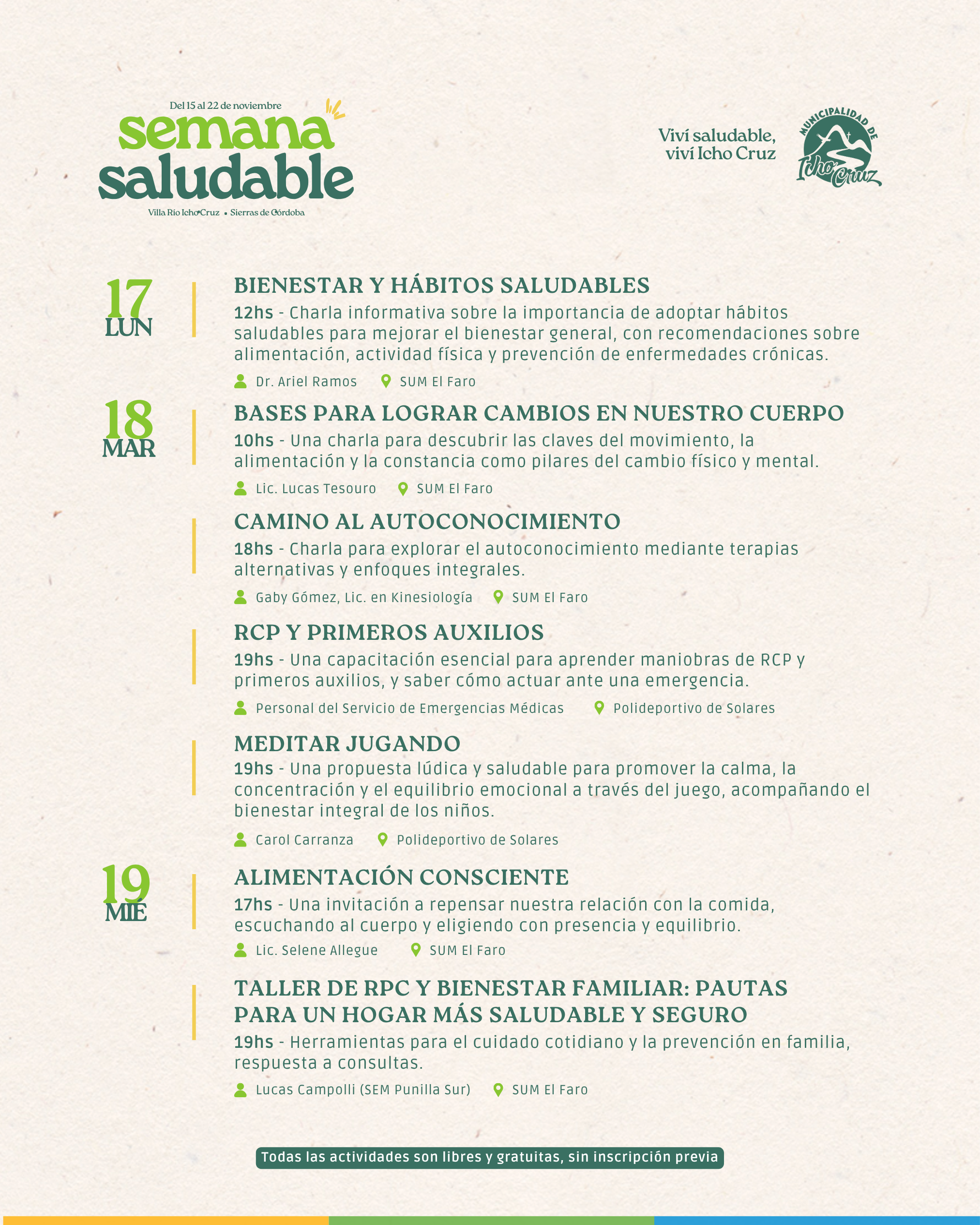 La Semana Saludable es impulsada por la Municipalidad de Icho Cruz, con la participación de referentes de la salud, el movimiento y la alimentación, buscando acercar herramientas que contribuyan al desarrollo personal y colectivo.