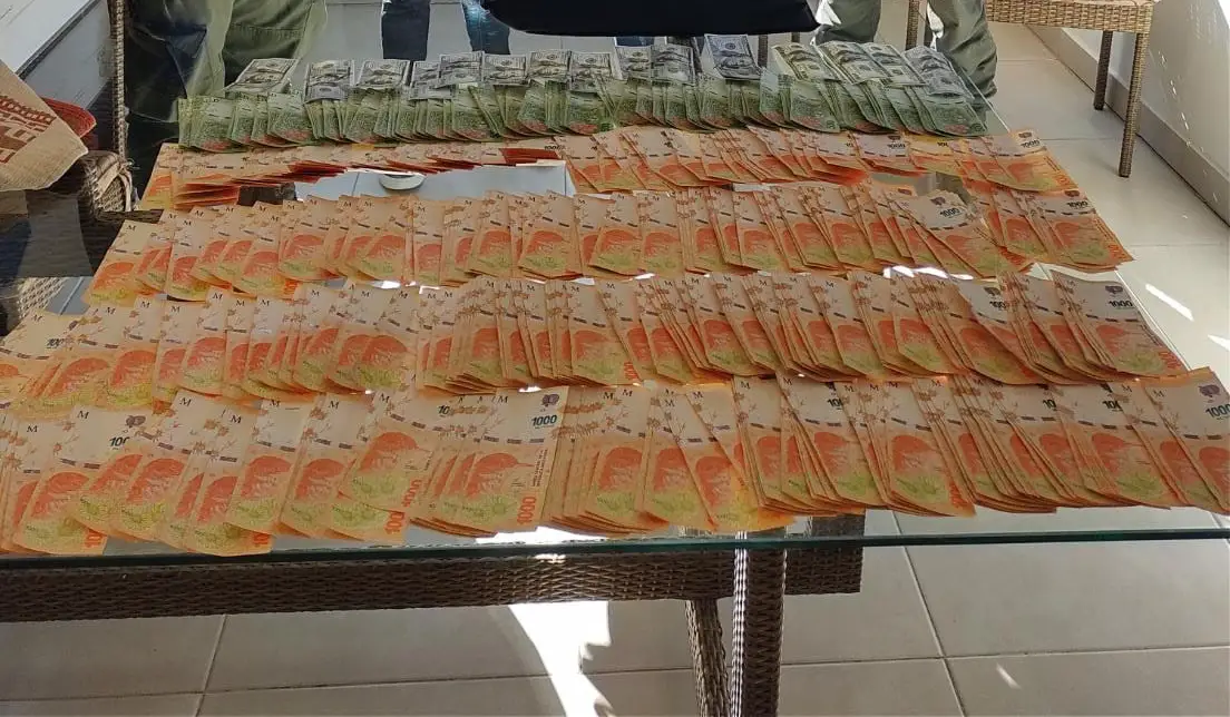 En los procedimientos hallaron 1.475.520 pesos argentinos, 1.000 dólares estadounidenses, 26,85 gramos marihuana, 5 gramos cocaína, 160 semillas marihuana, dos vehículos, una moto, un cuatriciclo, un rifle cal 22 y municiones.