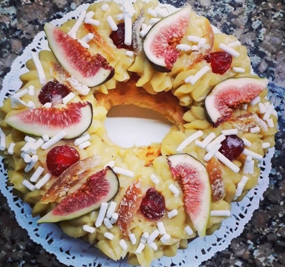 Colocamos la crema pastelera fría sobre la rosca. Llevamos a horno de 180 grados por 30 minutos. Una vez fuera del horno, pincelar con almíbar y decorar con cerezas al marraschino, fruta abrillantada y azúcar granulada. Se puede utilizar frutas frescas naturales como higos y cerezas.