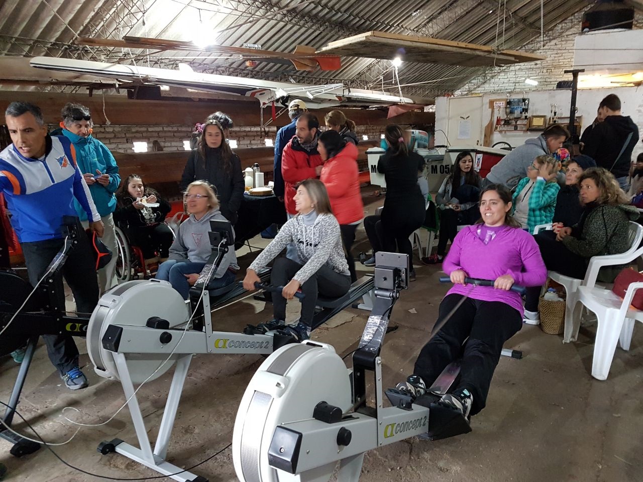 Por eso, varios miembros del equipo trajeron sus máquinas de remo y hubo una divertida serie deportiva en el interior de las instalaciones del Club, frente al lago San Roque. La opción de los profesores y directivos del club fue traer tres “Remorgómetros” conectados a una computadora y a una pantalla e improvisaron competencias internas.
