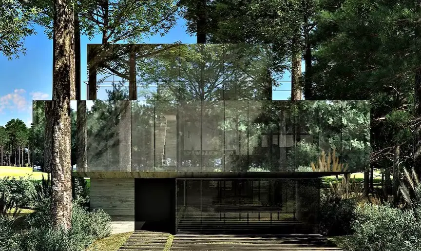 La propiedad logra pasar desapercibida a simple vista gracias a la ilusión que genera su arquitectura reflectante, desde la calle pareciera que no hay nada más que el bosque característico del lugar.