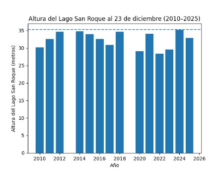 En el otro extremo se encuentran los años más lluviosos, en los que diciembre mostraba un San Roque muy bien posicionado de cara al verano. En ese grupo se destacan 2012, 2014, 2018 y 2021, con niveles que rondaban o superaban los 34 metros, anticipando temporadas con fuerte aporte hídrico. El caso más reciente y extremo fue 2024, cuando para esta misma fecha el lago alcanzaba los 35,18 metros, prácticamente en el vertedero, reflejando uno de los mejores escenarios hidrológicos de los últimos tiempos..