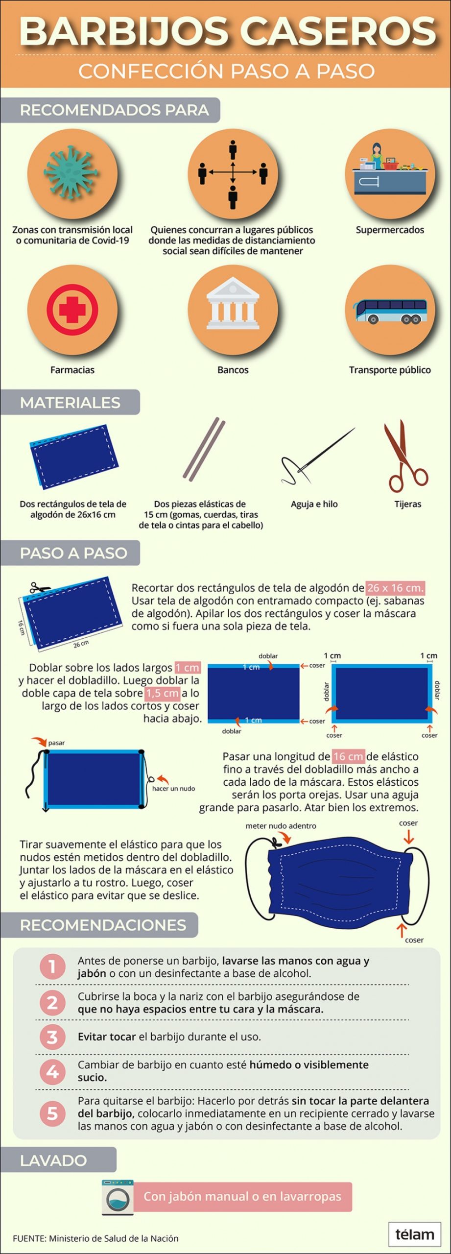 El Ministerio de Salud de la Nación elaboró una guía para confeccionar y utilizar adecuadamente los barbijos caseros. Ante la gran demanda, los barbijos quirúrgicos deben estar reservados para los trabajadores de la salud y los que se encuentran en la primera línea de atención a la población.