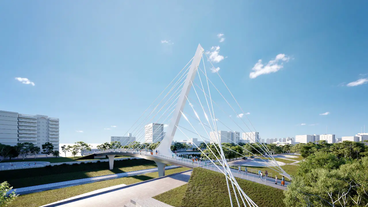 La estructura de metal confeccionada con un sistema atirantado tendrá 80 metros de longitud y 5,6 de ancho, con un área aproximada de 500 metros cuadrados. En su centro se alzará una columna de sección variable de 29 metros de alto, desde donde se aferrarán tirantes que mantendrán la solidés del puente.