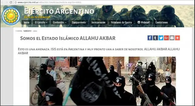 La página oficial del Ejército Argentino fue víctima del accionar de los piratas informáticos durante este lunes. Con consignas de ISIS y una foto con supuestos guerrilleros de ese grupo terrorista se señaló: “Esto es una amenaza. ISIS está en Argentina y muy pronto van a saber de nosotros”,
