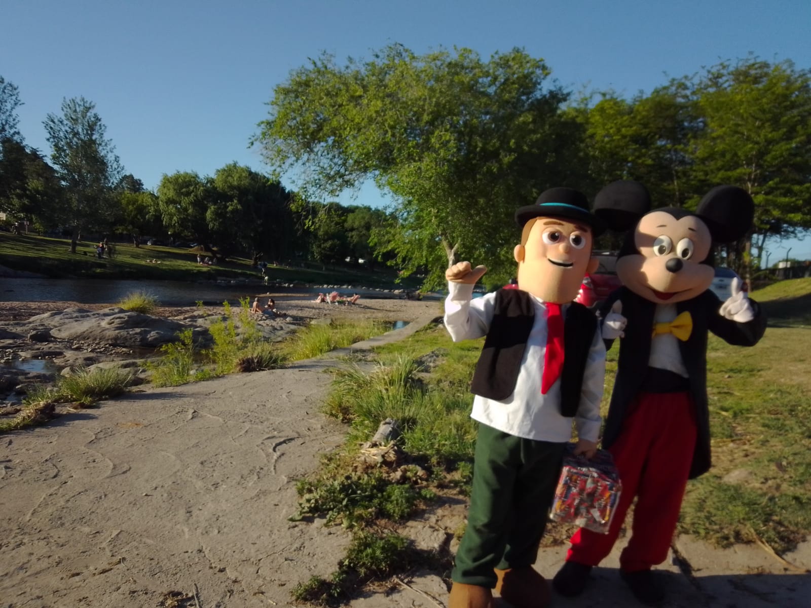 Hasta Mickey y Zenon se dieron una vuelta por el vado para sacarse fotos con los chicos. “Somos de un comedor de la Ruta 20”, contaron los personajes que pedían una colaboración a “voluntad” a los papás.