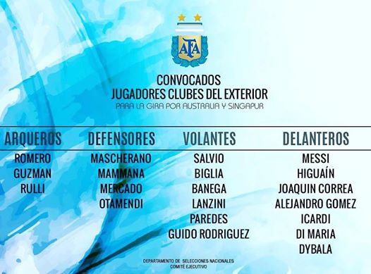 La lista de jugadores en el exterior esta compuesta por: Sergio Romero, Nahuel Guzman, Gerónimo Rulli, Gabriel Mercado, Nicolás Otamendi, Lucas Biglia, Javier Mascherano, Ángel di María, Gonzalo Higuaín, Mauro Icardi, Paulo Dybala, Lionel Messi, Emanuel Mammana, Éver Banega, Eduardo Salvio, Manuel Lanzini, Guido Rodríguez, Leandro Paredes, Alejandro Gómez y Joaquín Correa.