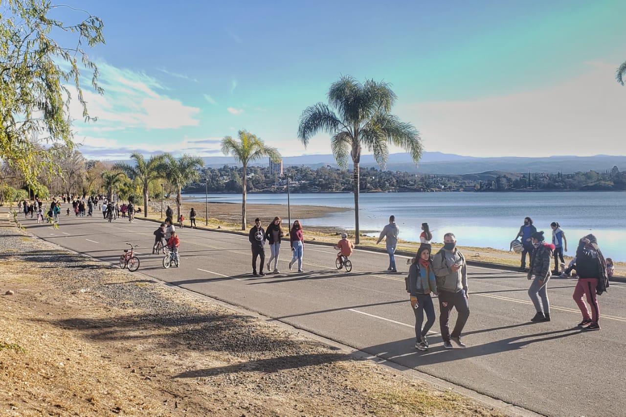 A pesar de las restricciones para salir y entrar de la ciudad desde los distintos ingresos y de que las salidas de esparcimiento están permitidas en los lugares donde cada persona tiene su domicilio, este domingo se vio una actitud más relajada entre los que se decidieron a dar una vuelta por la costanera del lago San Roque.