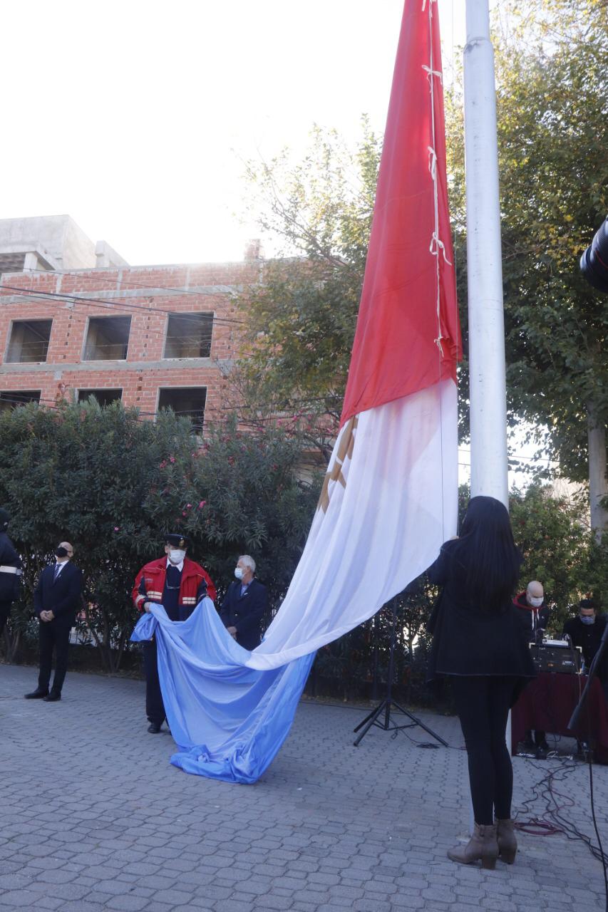 Del acto, también participó el Cuerpo de Bomberos Voluntarios y músicos locales que interpretaron el Himno Nacional.