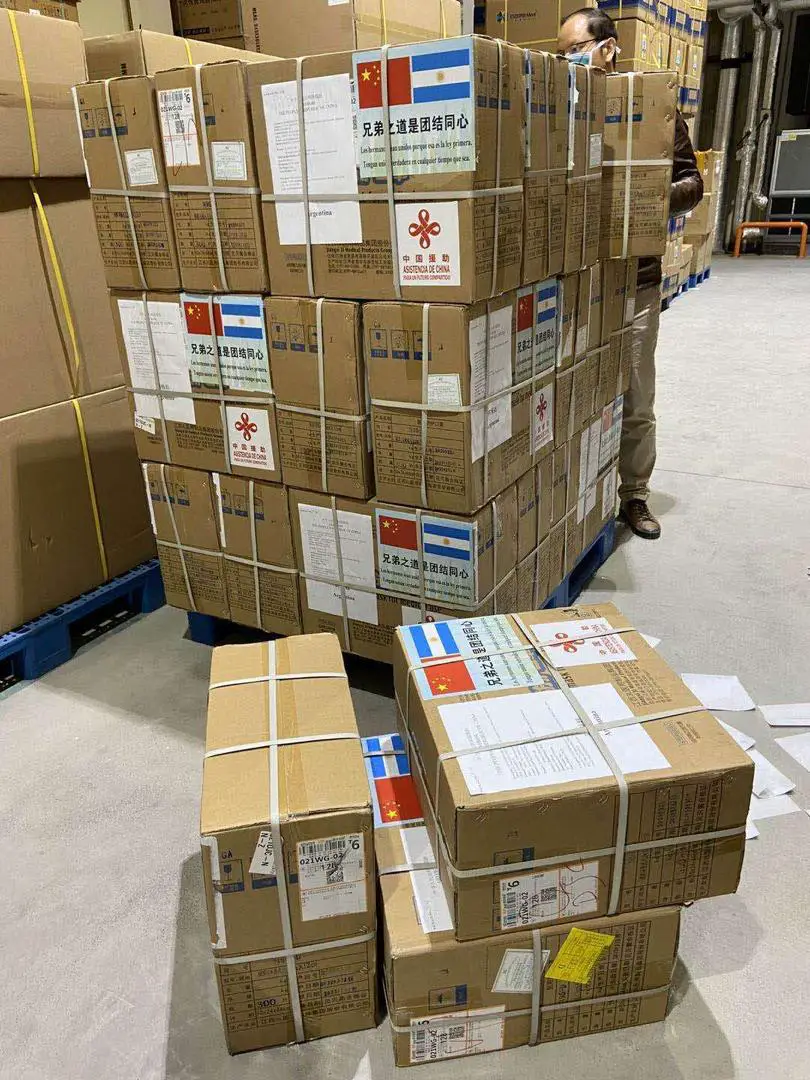 El vuelo, fue el primero de dos programados que en total traerán a Argentina: 5 mil trajes de protección, 10 mil máscaras protectoras para uso médico, 50 mil máscaras quirúrgicas, 1.000 viseras, 200 termómetros digitales, 1.000 pares de guantes y 1.000 cubiertas para zapatos destinados al Ministerio de Salud.