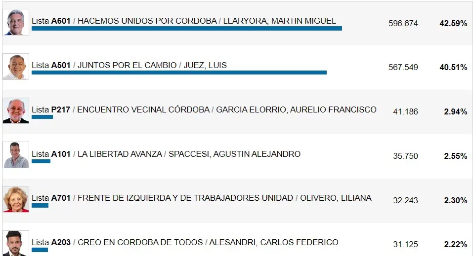 A las 0.11, el porcentaje era el siguiente: Martín Llaryora cosechaba el 42.63 por ciento de los sufragios y Luis Juez, el 39,93. En este corte, se había escrutado el 85,18 por ciento de los votos.