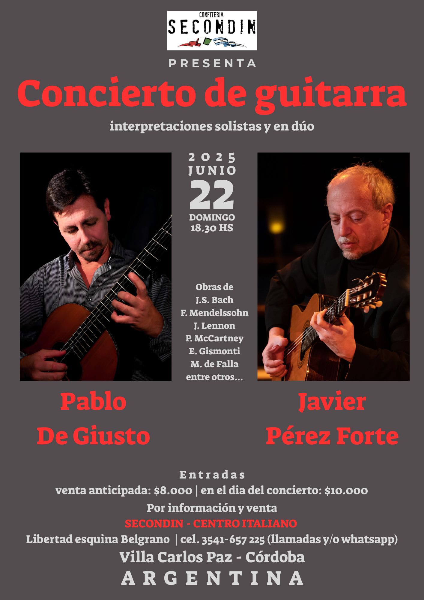 El próximo domingo 22 de junio se concretará en el Bar Sedondin del Centro Italiano de Villa Carlos Paz un gran concierto de guitarras protagonizado por una dupla de músicos muy conocida y querida en la ciudad como es la que conforman Javier Pérez Forte y Pablo De Giusto.