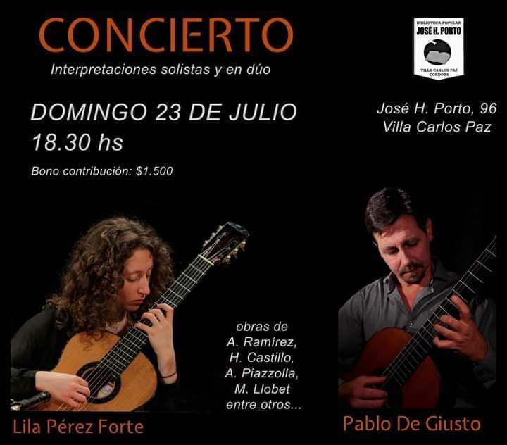 Los músicos Pablo De Giusto y Lila Pérez Forte, brindarán al público interpretaciones solistas y en dúo, este domingo 23 de julio a las 18,30 hs en la Biblioteca Popular H Porto.