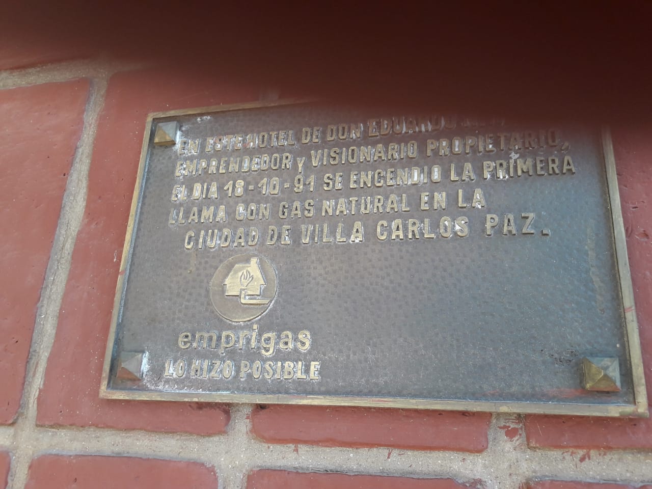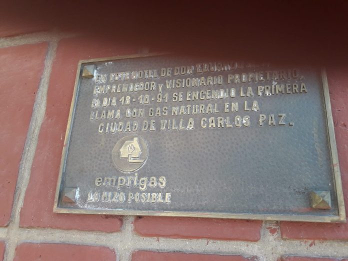 No la puso el ingeniero Carlos Felpeto que estaba terminando (en pleno lío) su segundo mandato de los 4 que tuvo como Intendente. La puso una empresa privada…y seguramente el dueño de la pared de este hotel…donde el bronce ya acusa como 28 inviernos calefaccionados.