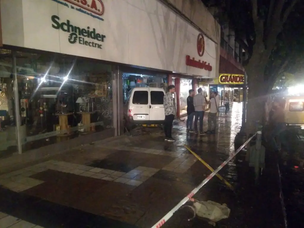 El episodio ocurrió alrededor de las 4:45 de este domingo. Tres personas circulaban en el utilitario por avenida 9 de Julio cuando, por causas que se tratan de establecer, el conductor perdió el control del coche y se incrustó en el local de la firma Electricidad Centro.