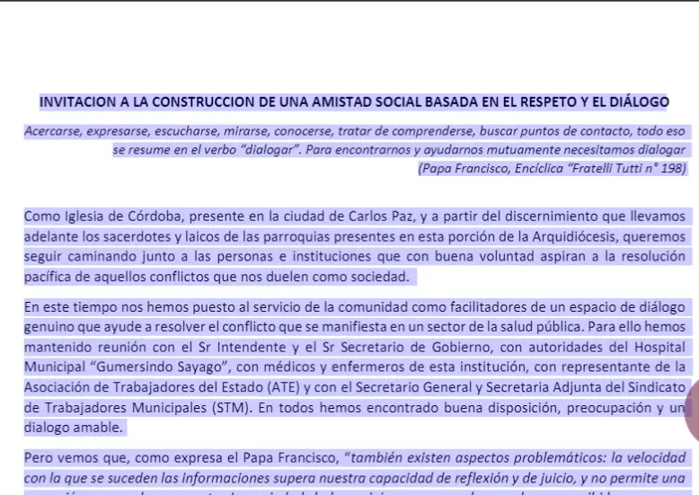A través de un comunicado que dieron a conocer a la comunidad, las tres parroquias de Carlos Paz instaron a los distintos sectores involucrados en el conflicto de la salud municipal a propender al diálogo para la construcción de la «amistad social».