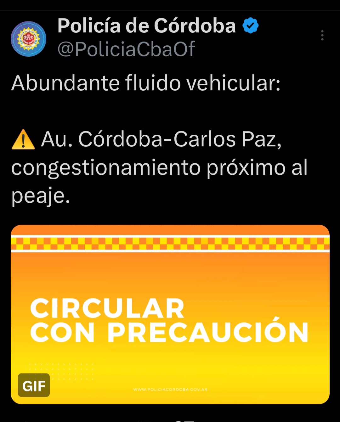 A través de sus redes sociales, la Policía de Córdoba informó sobre abundante flujo de tránsito en la Autopista Córdoba–Carlos Paz, con congestionamiento puntual en las inmediaciones del peaje, y solicitó a los conductores circular con precaución.