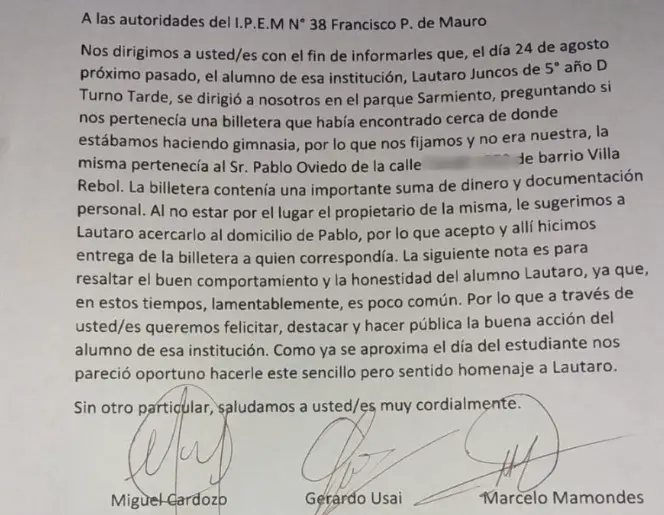 “La siguiente nota es para resaltar el buen comportamiento y la honestidad del alumno Lautaro, ya que, en estos tiempos, lamentablemente, es poco común. Por lo que a través de usted/es queremos felicitar, destacar y hacer pública la buena acción del alumno de esa institución. Como ya se aproxima el día del estudiante nos pareció oportuno hacerle este sencillo, pero sentido homenaje a Lautaro”.
