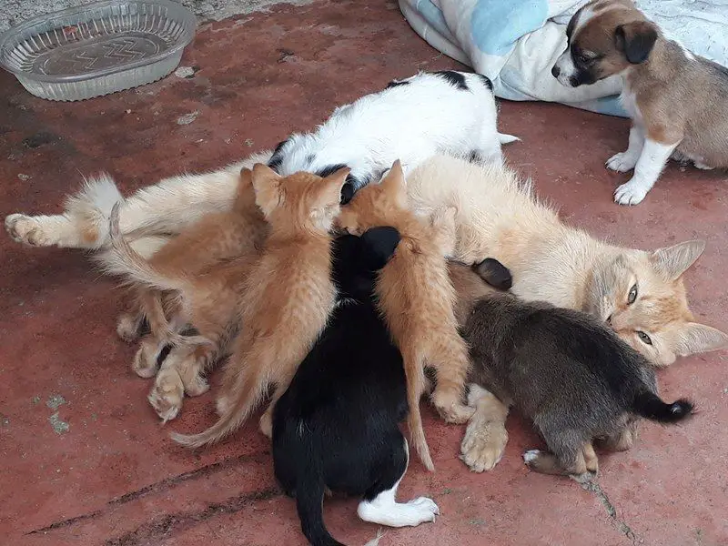 El amor materno hizo que la gata expusiera su cuerpo ante los cachorrito huérfanos: “Mientras la perrita no estaba, la gata se fue a la cuchita de los perritos y se dejó mamar. Y después fueron los gatitos detrás de ella, a la cucha de los cachorros”, relató.