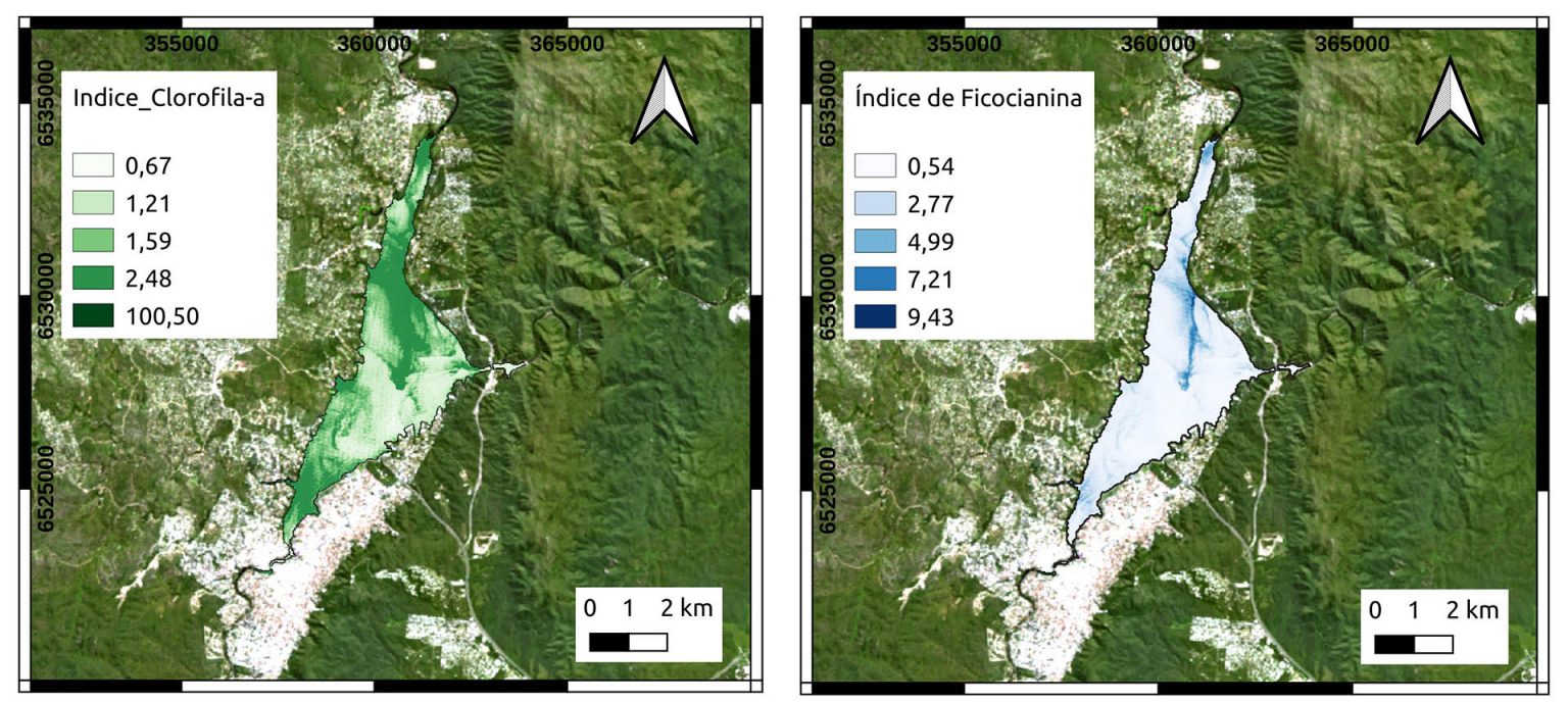 A través del procesamiento de imágenes satelitales, los investigadores puede determinar cuándo y dónde hay una gran presencia de algas y cianobacterias, gracias a la detección de la clorofila presente en ambas (mapa de la izquierda). También pueden determinar dónde hay más cianobacterias con la detección de ficocianina, un pigmento típico de este microorganismo (mapa de la derecha).