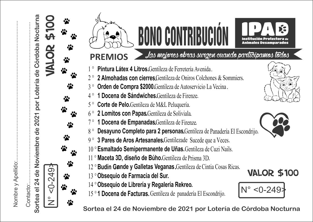 Ante esta situación, desde la protectora decidieron realizar un bono contribución de tan sólo 100 pesos donde la comunidad no sólo podrá ayudar, sino que además podrá obtener uno de los 15 premios que se sortean el próximo 24 de noviembre por Lotería nocturna de Córdoba.