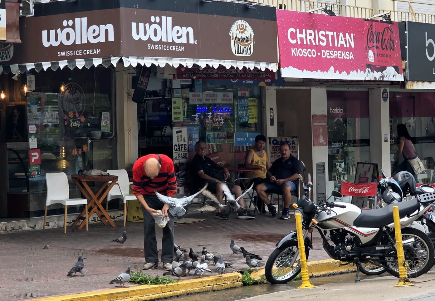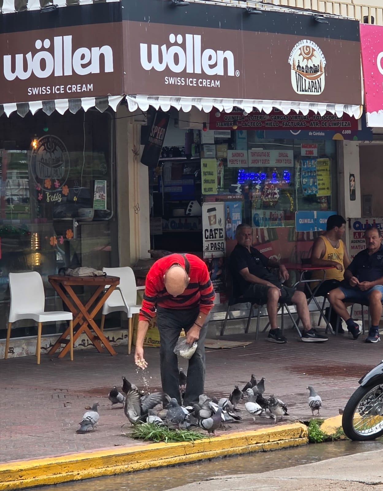 Y ahí, como si el tiempo se aflojara apenas, aparece la escena: un señor mayor, miguitas en mano, dándole de comer a sus amigas.