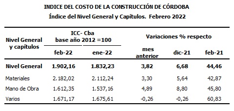 Durante el mes de febrero de 2022, el Índice del Costo de la Construcción de Córdoba (ICC- Cba) registró una variación mensual del 3,82% en su Nivel General y del 44,46% en relación a febrero de 2021. El costo del metro cuadrado, por su parte, asumió un valor de $65.447,1.