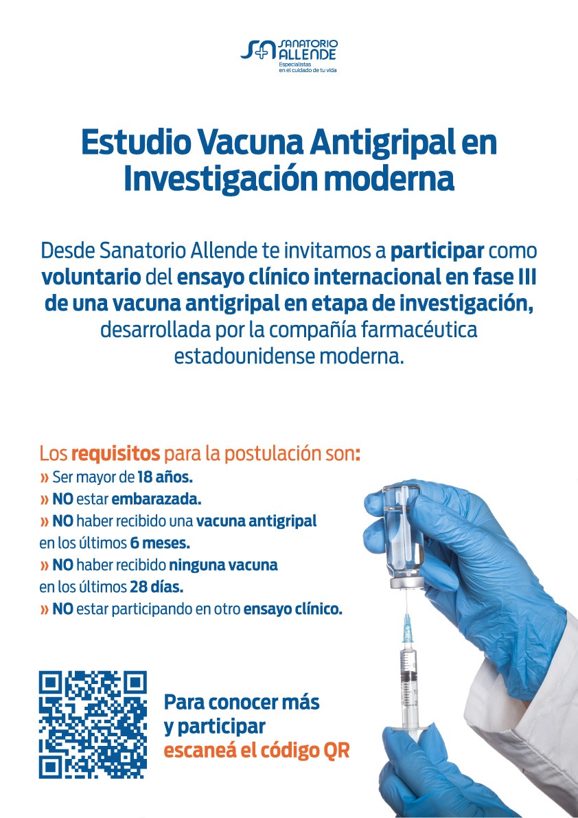 Sanatorio Allende de la ciudad de Córdoba se encuentra realizando el Estudio de Vacuna Anigripal en Investigación Moderna. Por tal motivo, convoca a 500 voluntarios para participar del ensayo clínico internacional en fase III de una vacuna antigripal en etapa de investigación, desarrollada por la compañía farmacéutica estadounidense Moderna.