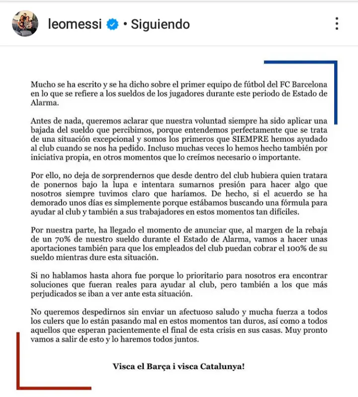Lionel Messi anunció en un comunicado, el cual luego fue replicado por sus compañeros, que dada la crisis por la pandemia de Covid-19 todo el plantel del Barcelona rebajará su salario mensual en un 70% para colaborar con la economía del club.