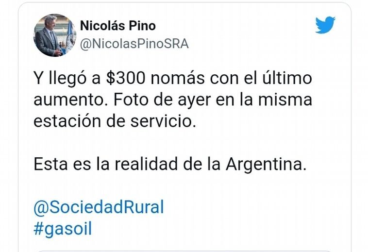 El presidente de la Sociedad Rural, Nicolás Pino, denunció desde su cuenta de Twitter que en Corrientes el gasoil ya se vende a casi a $ 300 el litro.