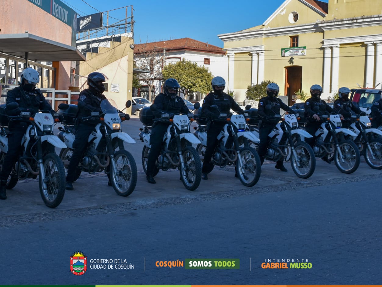 En la mañana de este viernes, el intendente de Cosquín, Gabriel Musso, junto a funcionarios de diversas áreas del municipio y el Director de la Departamental Norte de la Policía de la provincia de Córdoba, el comisario Mayor, Diego Bracamonte, recibieron al personal de Motocicletas del Grupo E.M.E de Punilla que cuentan con equipos de comunicación portátiles de última tecnología para el control de seguridad en la vía pública.