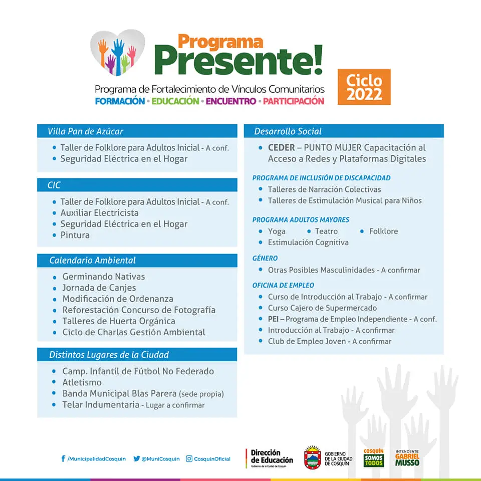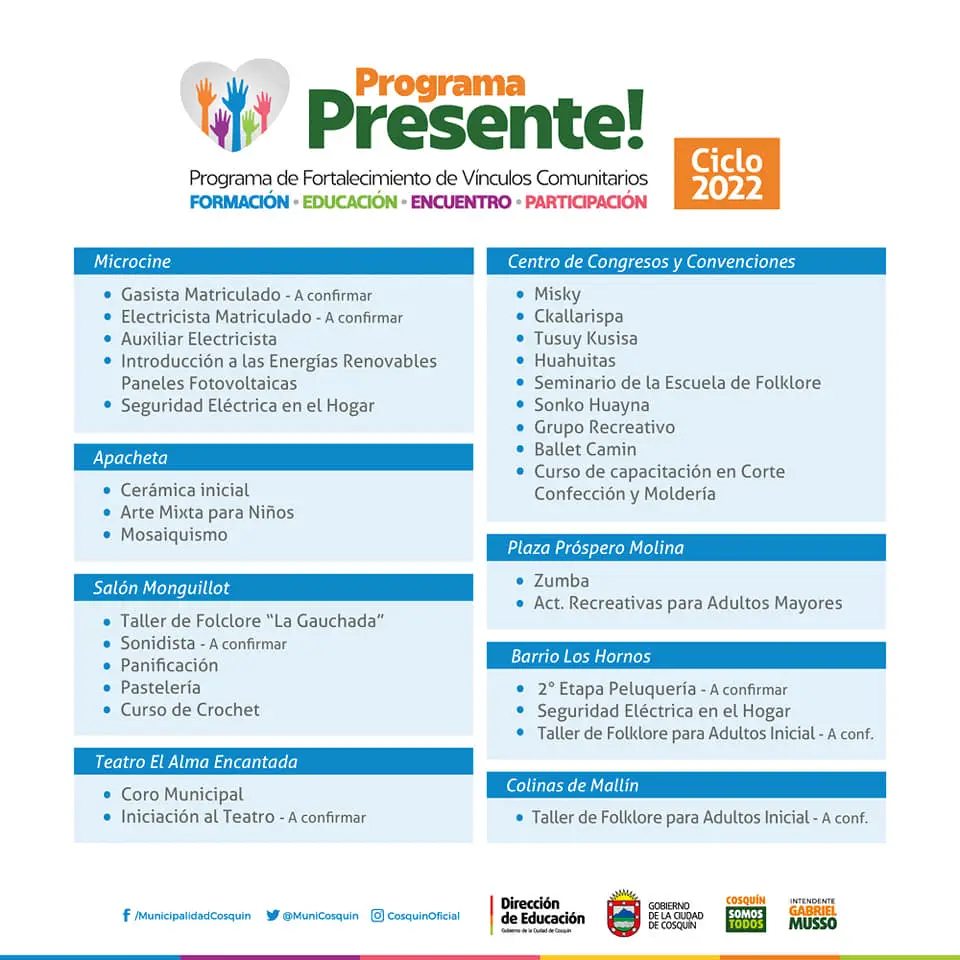 En la mañana de martes, el intendente de Cosquín Gabriel Musso acompañado por miembros de su Gabinete, presentó el ciclo 2022 del Programa Presente, que propone actividades y talleres gratuitos para toda la comunidad.