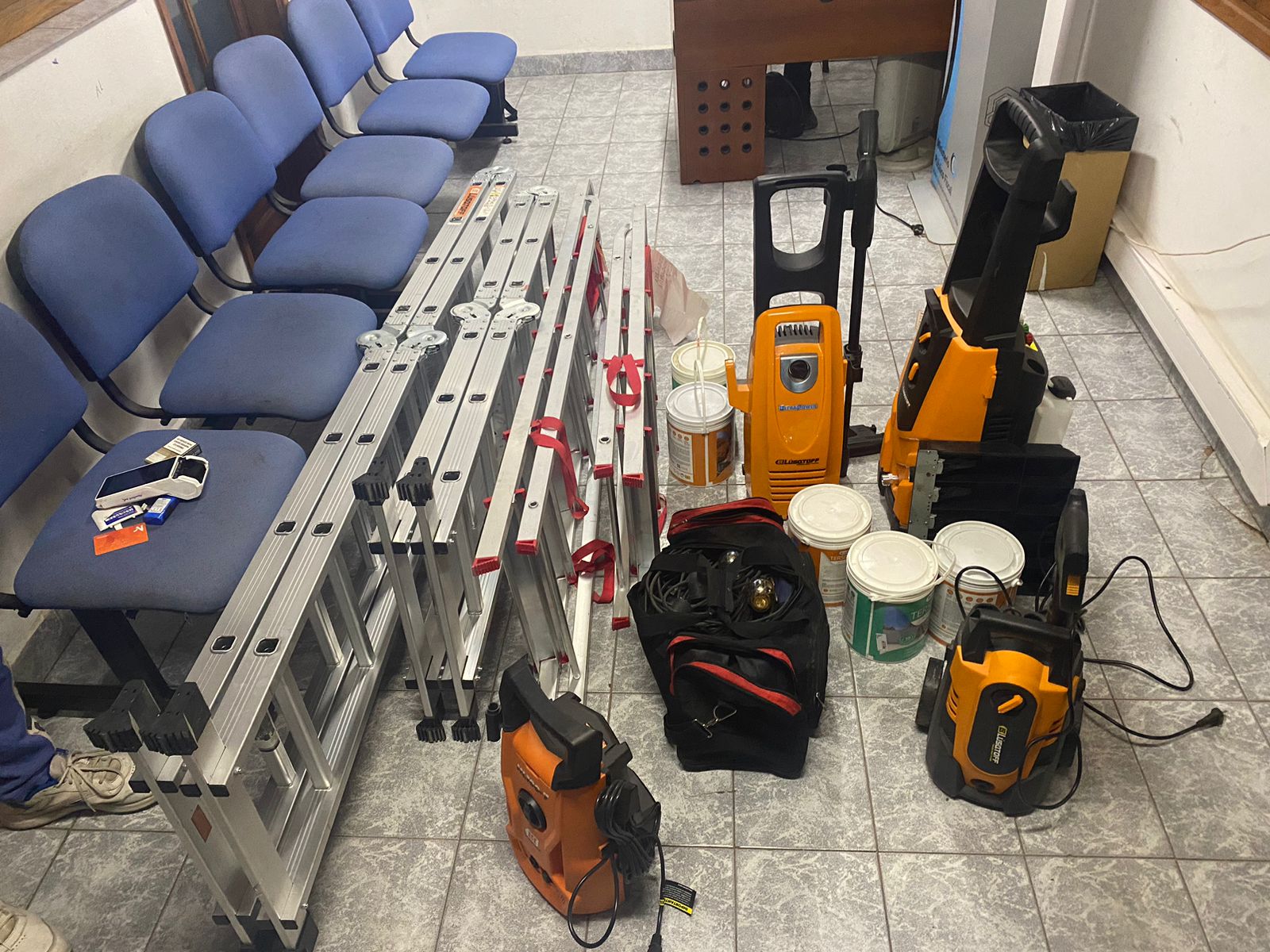 Los mismos tenían en su poder 4 hidrolavadoras, 4 escaleras, 5 tarros de pintura, un posnet, una caja registradora, un control remoto, luces, un bolso con guirnalda de luces y dinero en efectivo.