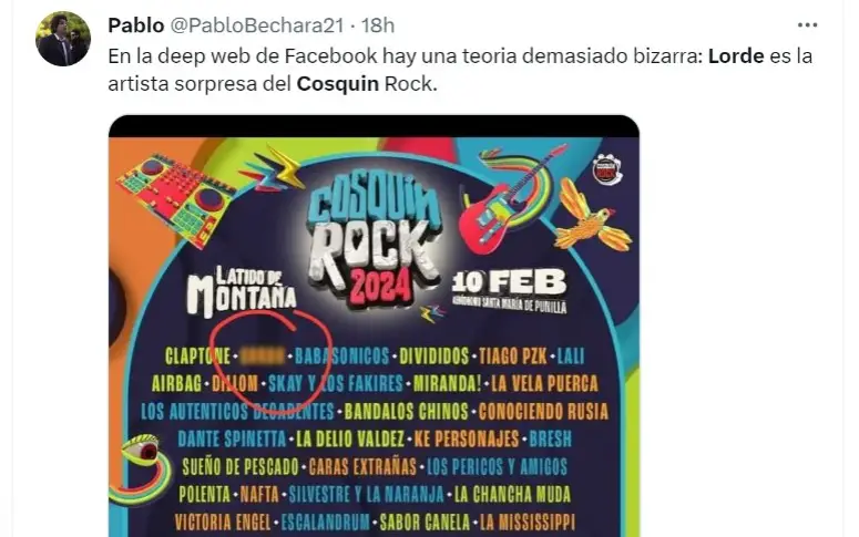 Sabemos que internet y sus redes sociales son especialistas en generar teorías de todo tipo y en producir información sin fundamentos. Cosquín Rock no es la excepción y a raíz de un artista “caído” a último momento, su programación se publicó con un nombre borroso que llamó la atención y generó todo tipo de especulaciones.