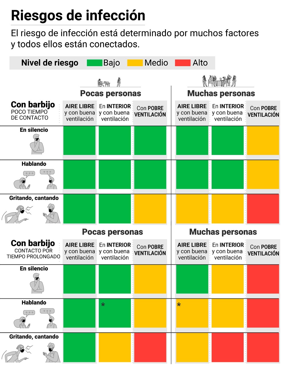 Las acciones de las personas determinan también las posibilidades de contagio: estar en silencio e inclusive hablando se considera más seguro que gritar o cantar, factor que aumenta el riesgo si son más de tres personas las que interaccionan.
