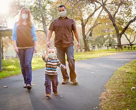 Se manifiesta como riesgo menor (en verde) cuando se utiliza esta protección, principalmente si es corto el tiempo de contacto –hasta tres minutos-, y se incrementa (en amarillo) si es mayor ese tiempo; aumenta aún más si se trata de un encuentro entre dos o más personas y es pobre la ventilación (en rojo) del espacio.