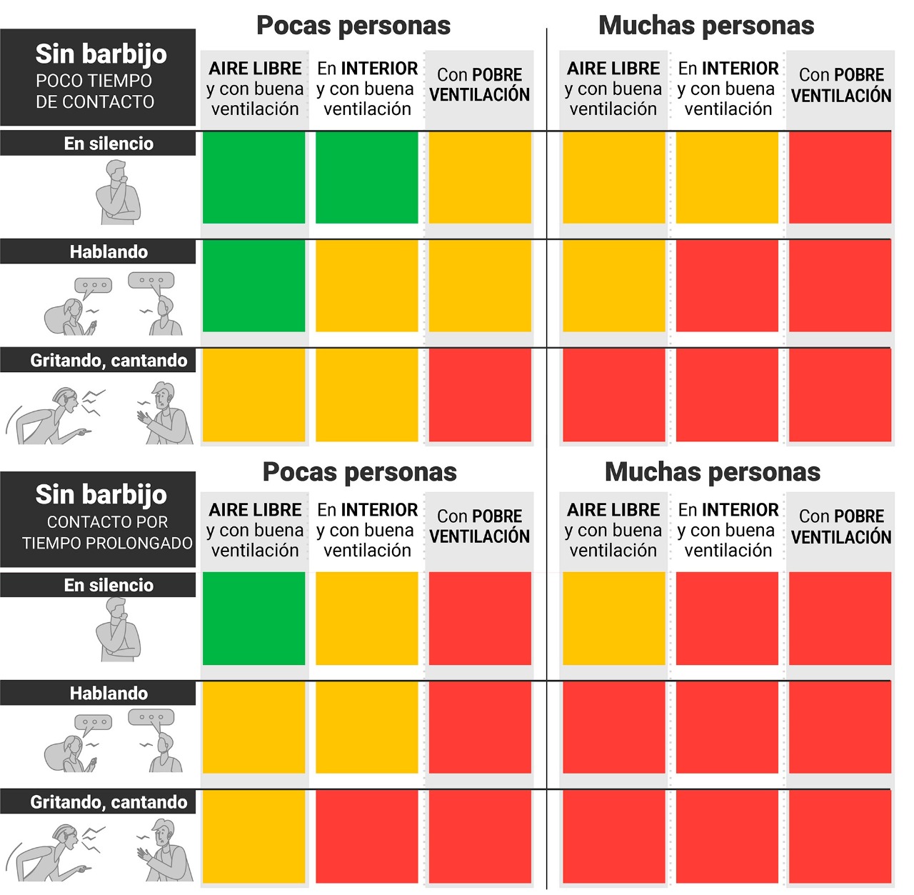Además, es clave tener en cuenta la ventilación de un espacio; mientras que al aire libre y con buena ventilación el riesgo es menor (en verde y en amarillo), el riesgo se incrementa si la interacción se da en un espacio interior y con buena ventilación, (predomina el amarillo si es entre dos personas, y el rojo si son más de dos), y más aún si la ventilación es pobre.