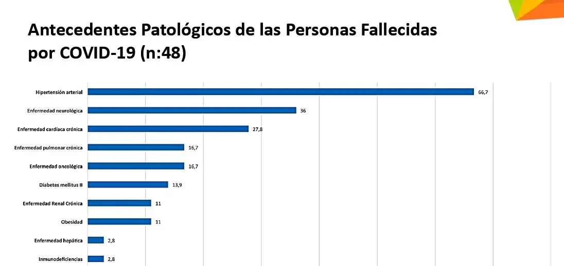 Quienes fallecieron presentaban antecedentes patológicos como hipertensión arterial, enfermedades neurológicas, cardíacas o pulmonares. Como así también enfermedades oncológicas, diabetes mellitus, enfermedad renal crónica, obesidad y patologías hepáticas o inmunodeficiencias, en menor medida.