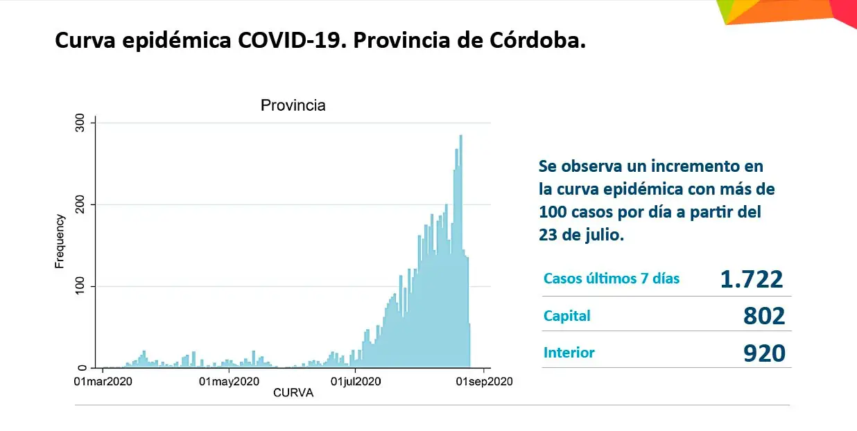 En relación a la curva epidémica, se observó un incremento sostenido en la misma, con más de 100 casos por día a partir del 23 de julio y un aumento de número de casos en el interior provincial.