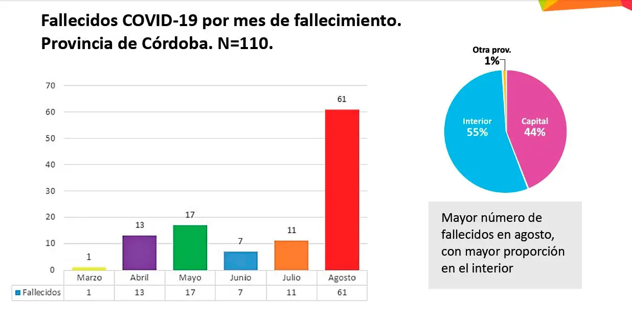 En total hubo 110 fallecidos (54% varones y 46% mujeres) durante la pandemia, 61 de los cuales se dieron en el mes de agosto, y la gran mayoría corresponde a personas del interior de la provincia.
