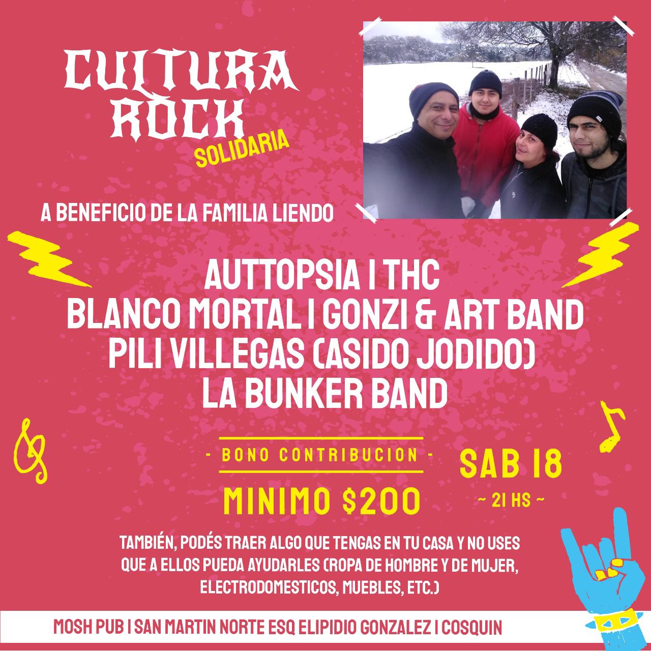 Este sábado 18 de diciembre desde las 21 horas en Mosh Pub de Cosquín (Ruta 38 esquina Elipidio González, camino a La Falda) se realizará el primer encuentro de bandas a beneficio.