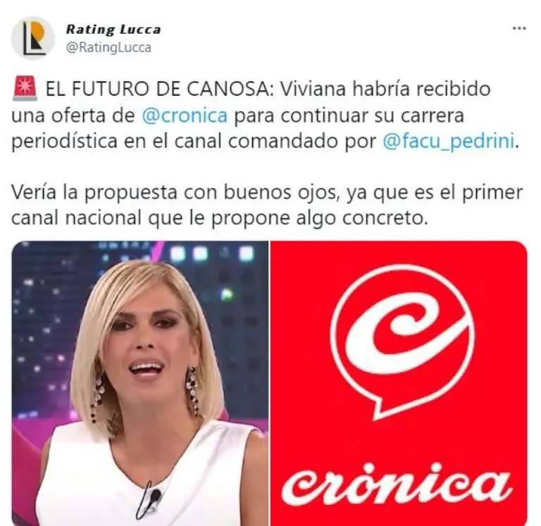 Según publicaron en la cuenta de Twitter @ratinglucca, Crónica TV habría llamado a la periodista Viviana Canosa para que forme parte de su staff. «Viviana habría recibido una oferta de Crónica para continuar su carrera periodística en el canal comandado por @facu_pedrini. Vería la propuesta con buenos ojos, ya que es el primer canal nacional que le propone algo concreto», decía el escrito en esa red social.