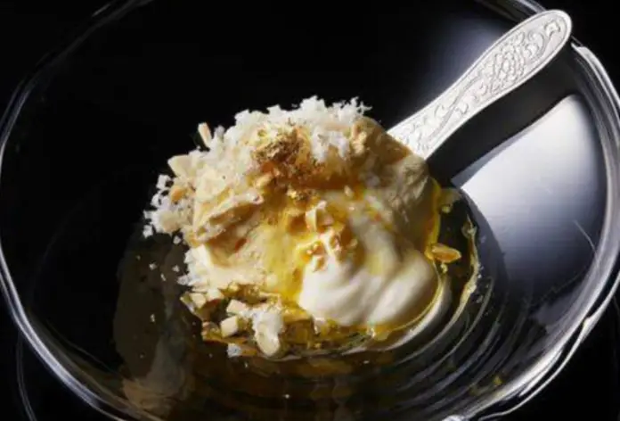 Lleva dos tipos de queso como base y “skekasu”, un componente procedente de Japón, parecido a una pasta y derivado del proceso de elaboración de “lías de sak”’, un producto tradicional del país. Para culminar el helado, le esparcen pan de oro.